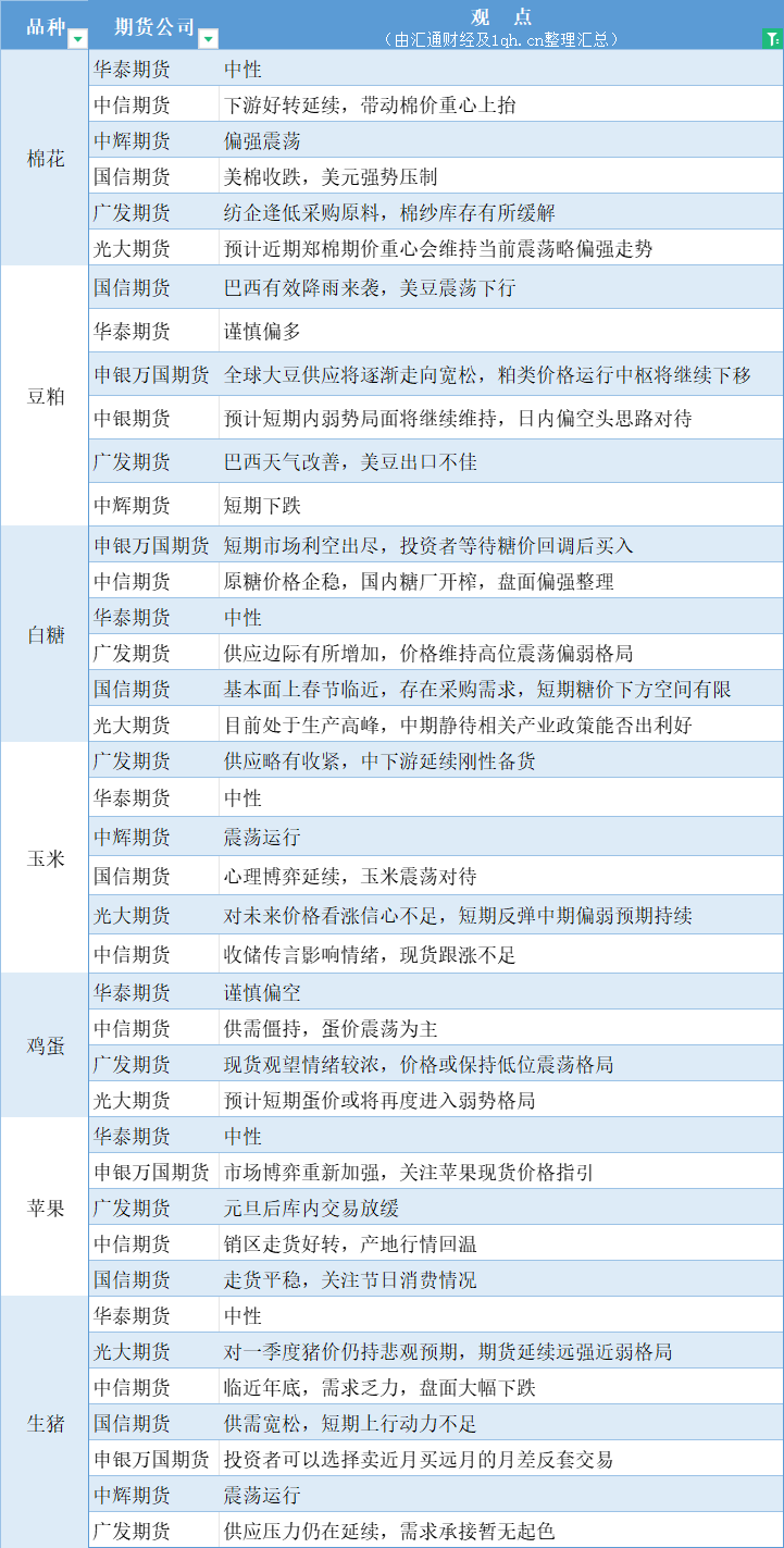 期货公司观点汇总一张图:1月3日农产品(棉花、豆粕、白糖、玉米、鸡蛋、生猪等)