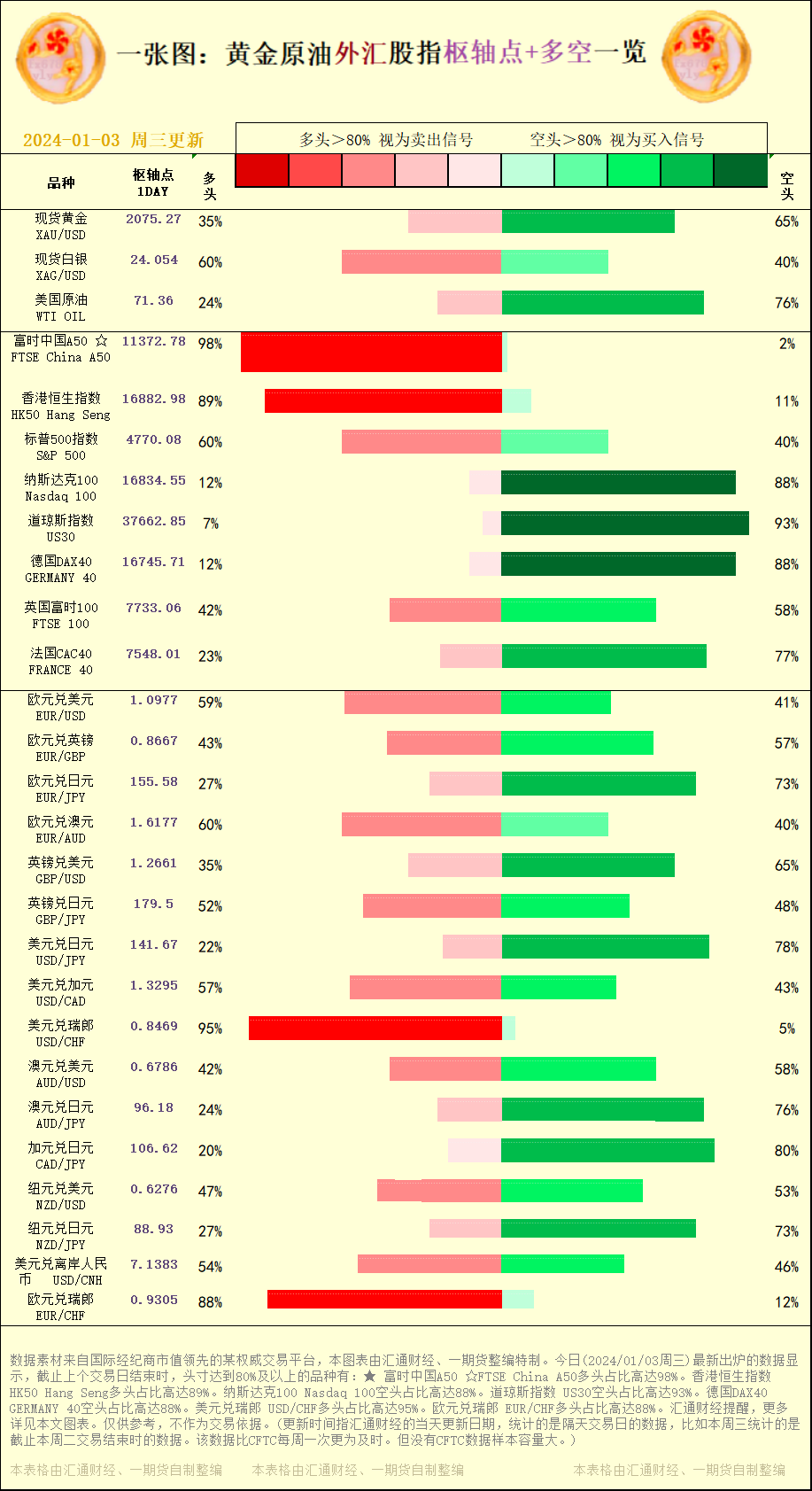 一张图:2024/01/03黄金原油外汇股指"枢纽点+多空占比"一览