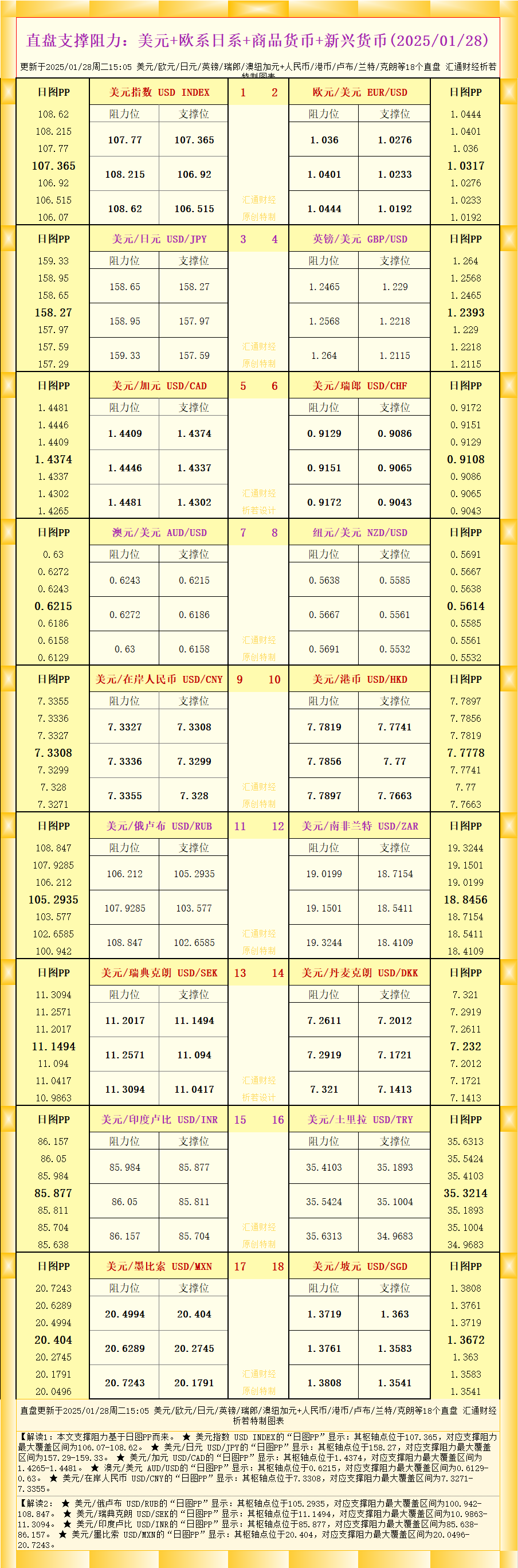 一张图看18个直盘外汇支撑阻力:美元+欧系日系+商品货币+新兴货币(2025/01/28)