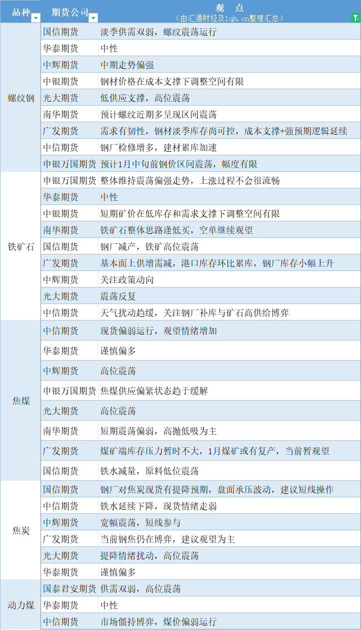 期货公司观点汇总一张图:1月2日黑色系(螺纹钢、焦煤、焦炭、铁矿石、动力煤等)