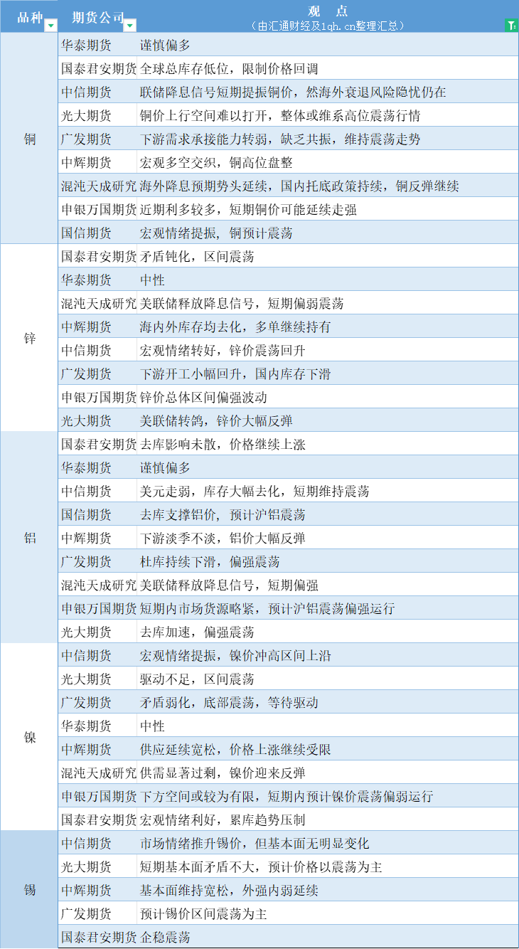 期货公司观点汇总一张图:12月18日有色系(铜、锌、铝、镍、锡等)