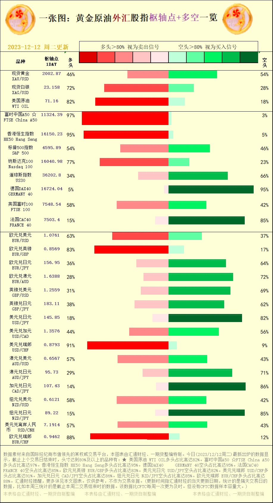 一张图:2023/12/12黄金原油外汇股指"枢纽点+多空占比"一览