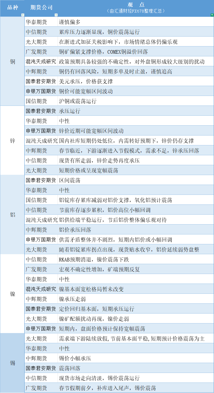 期货公司观点汇总一张图:1月24日有色系(铜、锌、铝、镍、锡等)