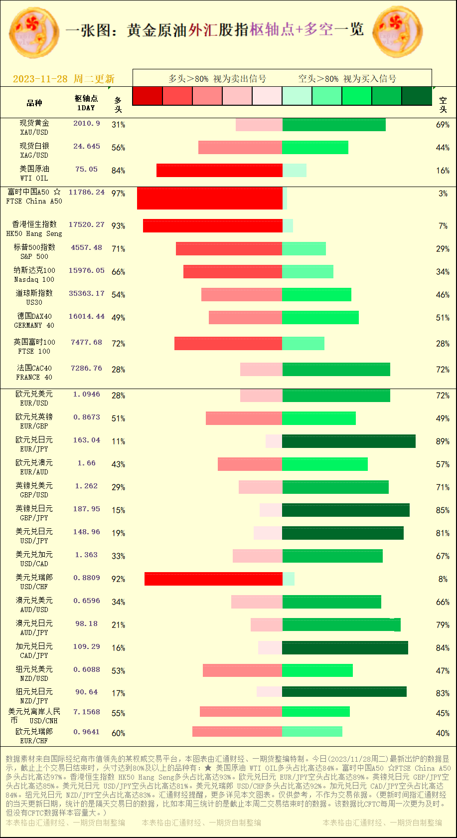 一张图:2023/11/28黄金原油外汇股指"枢纽点+多空占比"一览