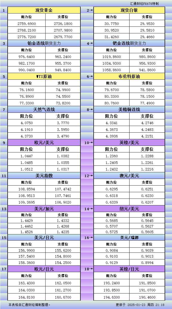 1月23日美市更新支撑阻力:18品种支撑阻力(金银铂钯原油天然气铜及十大货币对)