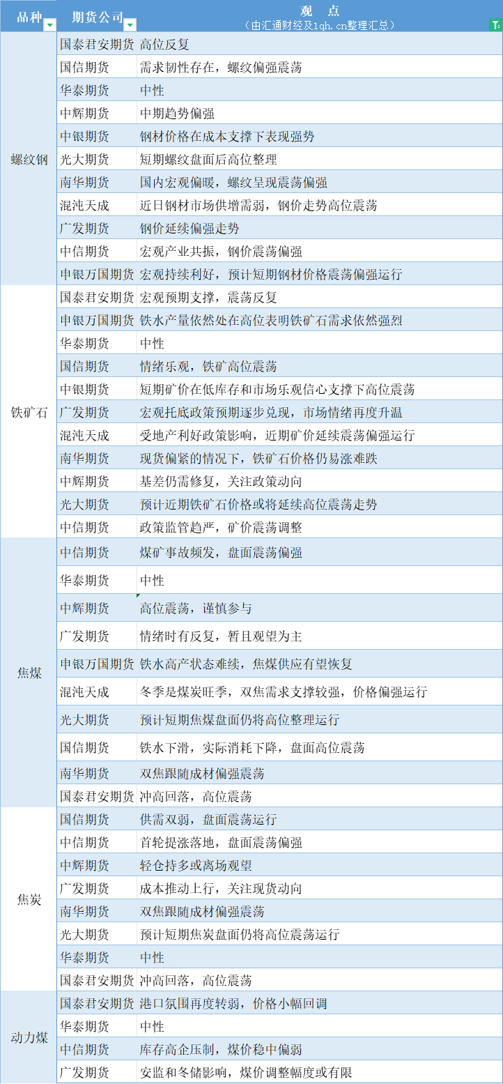 期货公司观点汇总一张图:11月22日黑色系(螺纹钢、焦煤、焦炭、铁矿石、动力煤等)