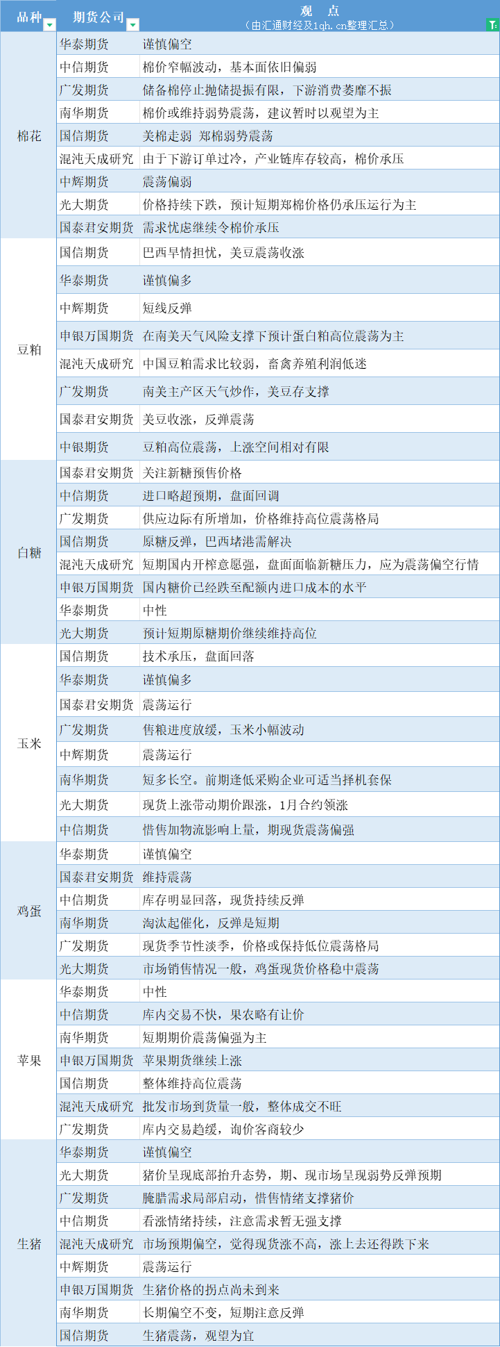 期货公司观点汇总一张图:11月22日农产品(棉花、豆粕、白糖、玉米、鸡蛋、生猪等)