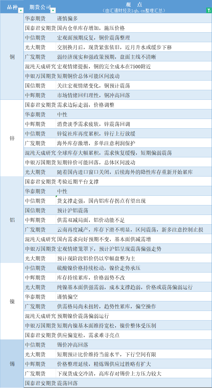 期货公司观点汇总一张图:11月17日有色系(铜、锌、铝、镍、锡等)