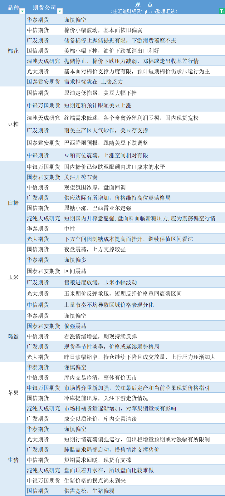 期货公司观点汇总一张图:11月17日农产品(棉花、豆粕、白糖、玉米、鸡蛋、生猪等)