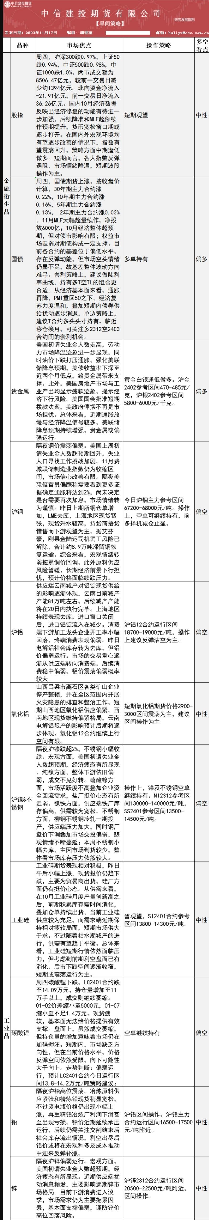 中信建投期货11月17日早间交易策略