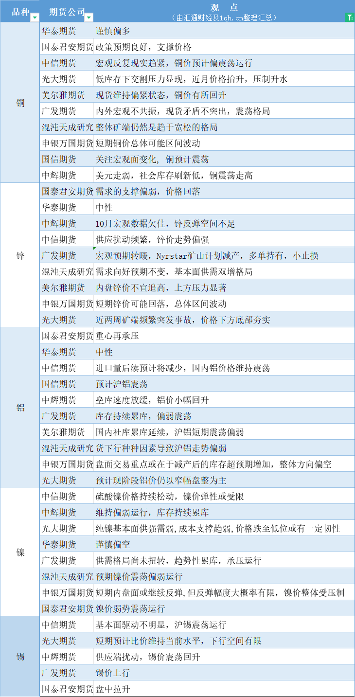期货公司观点汇总一张图:11月14日有色系(铜、锌、铝、镍、锡等)
