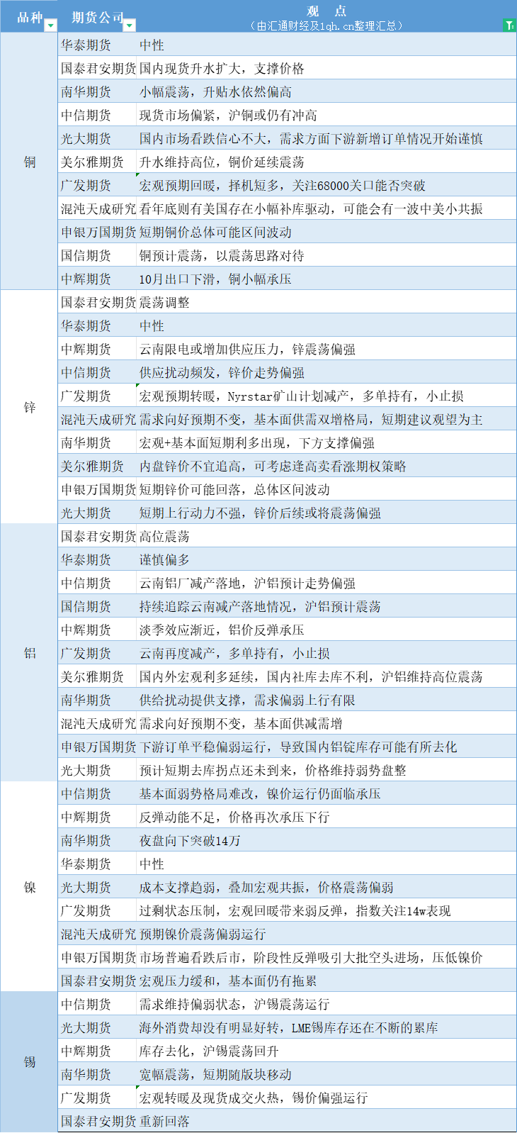 期货公司观点汇总一张图:11月8日有色系(铜、锌、铝、镍、锡等)