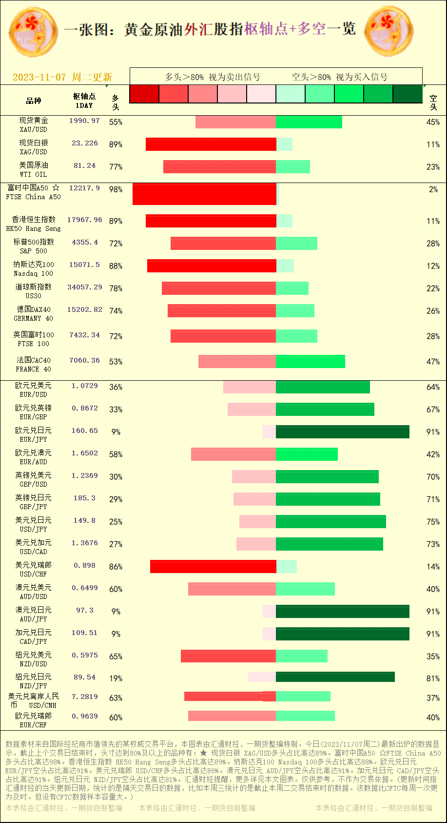 一张图:2023/11/07黄金原油外汇股指"枢纽点+多空占比"一览