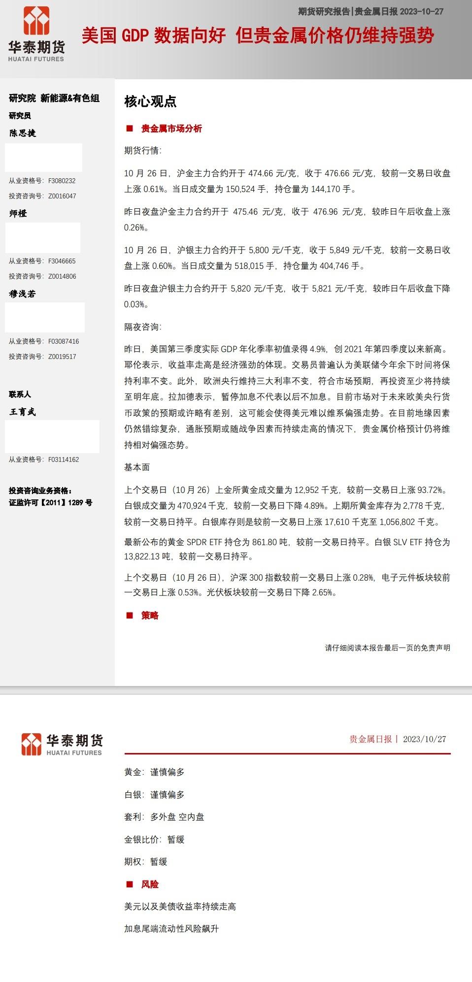 华泰期货10月27日贵金属日报:美国GDP数据向好 但贵金属价格仍维持强势