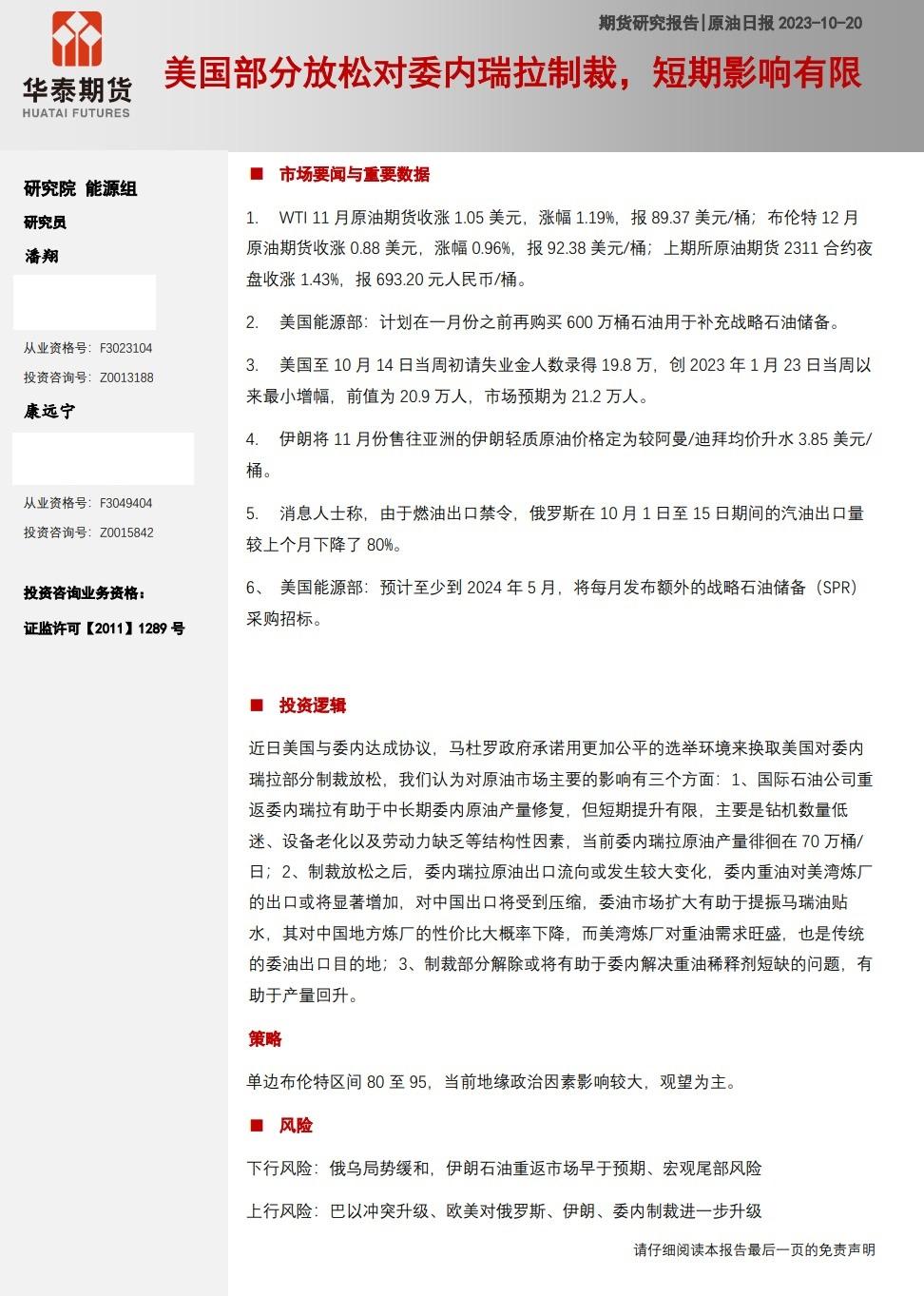 华泰期货10月20日原油日报:美国部分放松对委内瑞拉制裁,短期影响有限