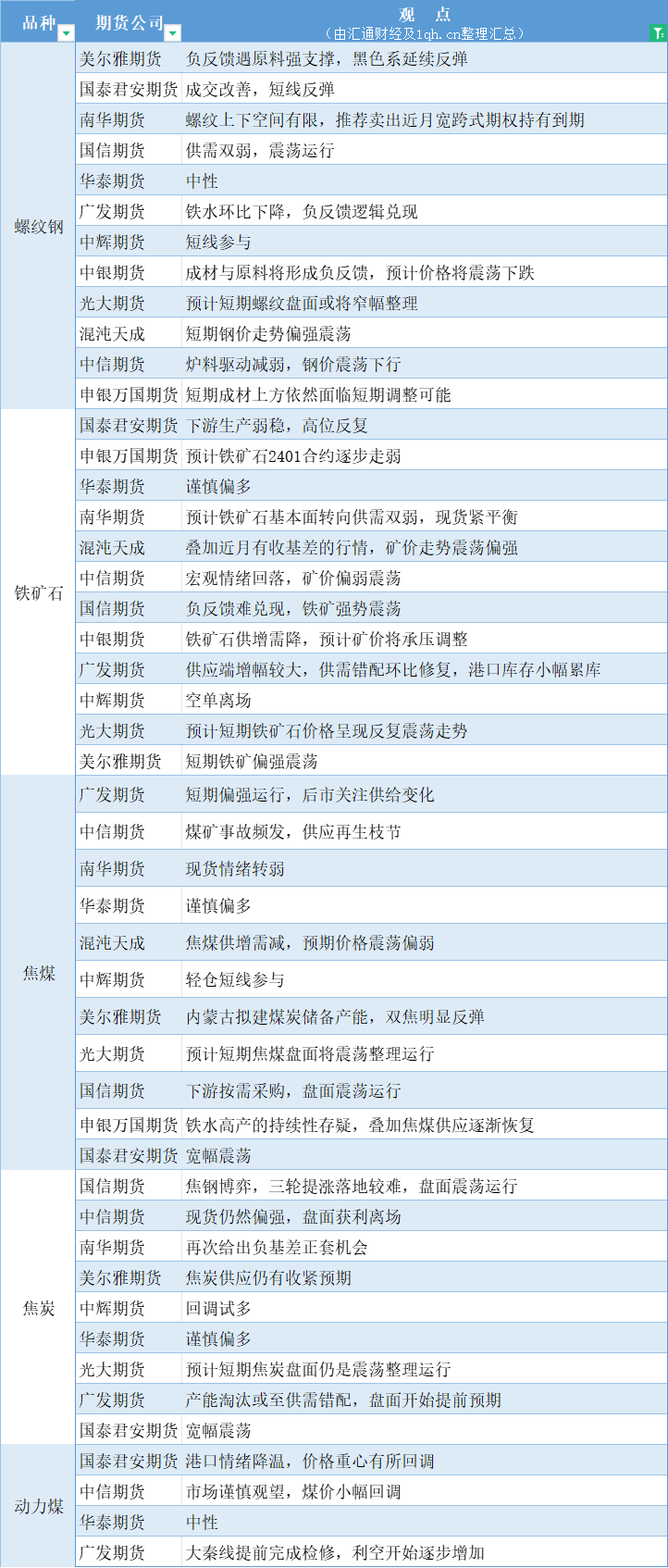 期货公司观点汇总一张图:10月17日黑色系(螺纹钢、焦煤、焦炭、铁矿石、动力煤等)
