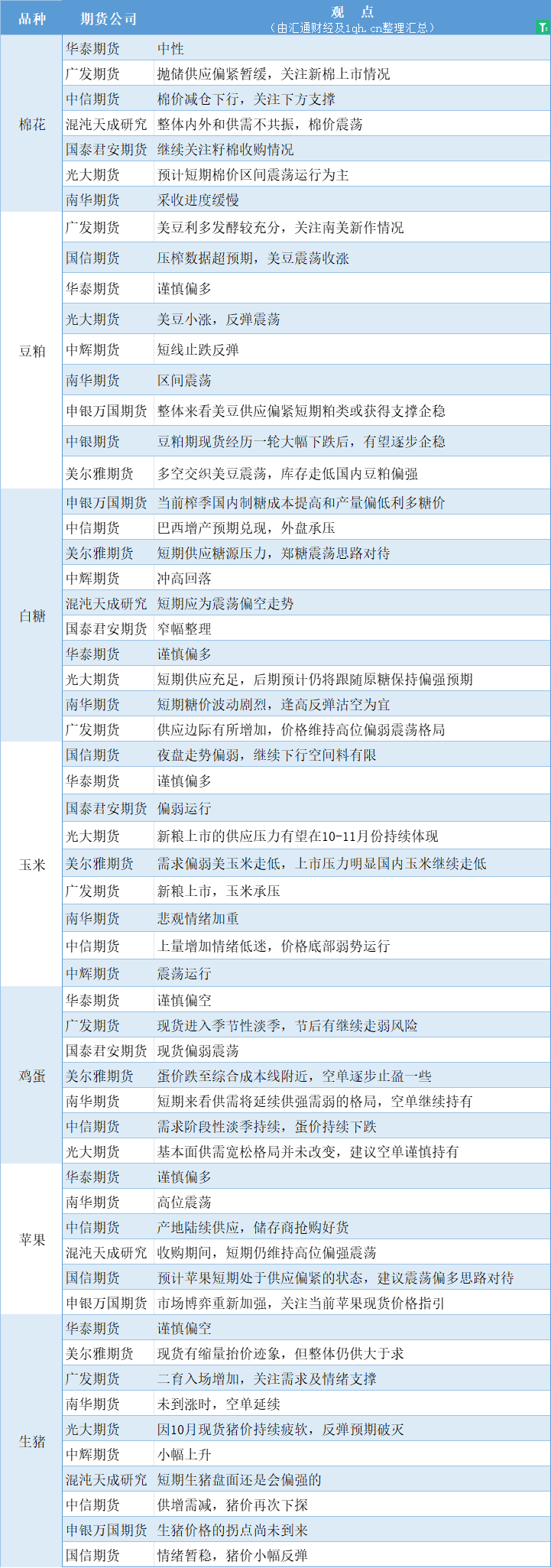 期货公司观点汇总一张图:10月17日农产品(棉花、豆粕、白糖、玉米、鸡蛋、生猪等)