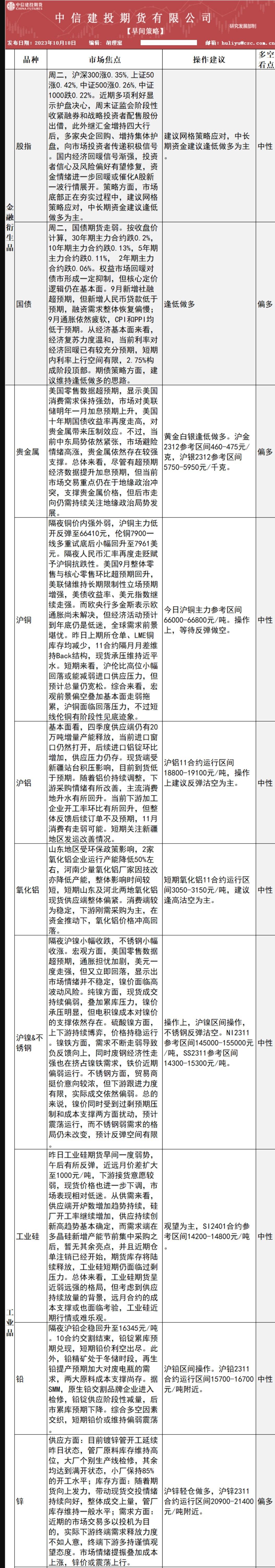 中信建投期货10月18日早间交易策略