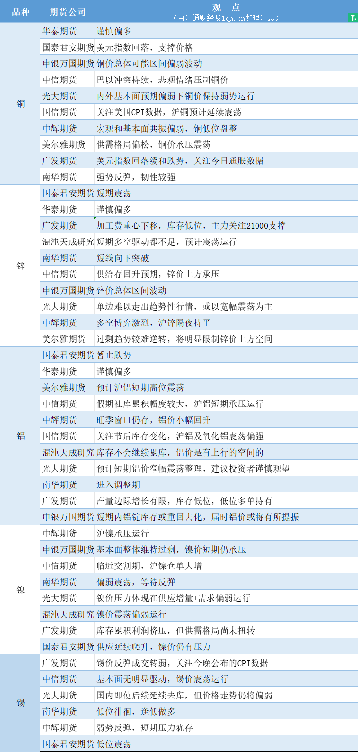 期货公司观点汇总一张图:10月12日有色系(铜、锌、铝、镍、锡等)