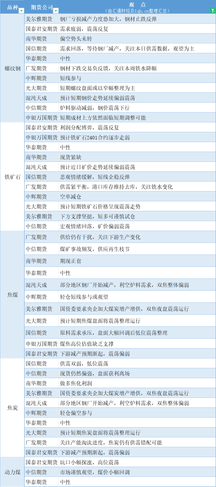 期货公司观点汇总一张图:10月13日黑色系(螺纹钢、焦煤、焦炭、铁矿石、动力煤等)