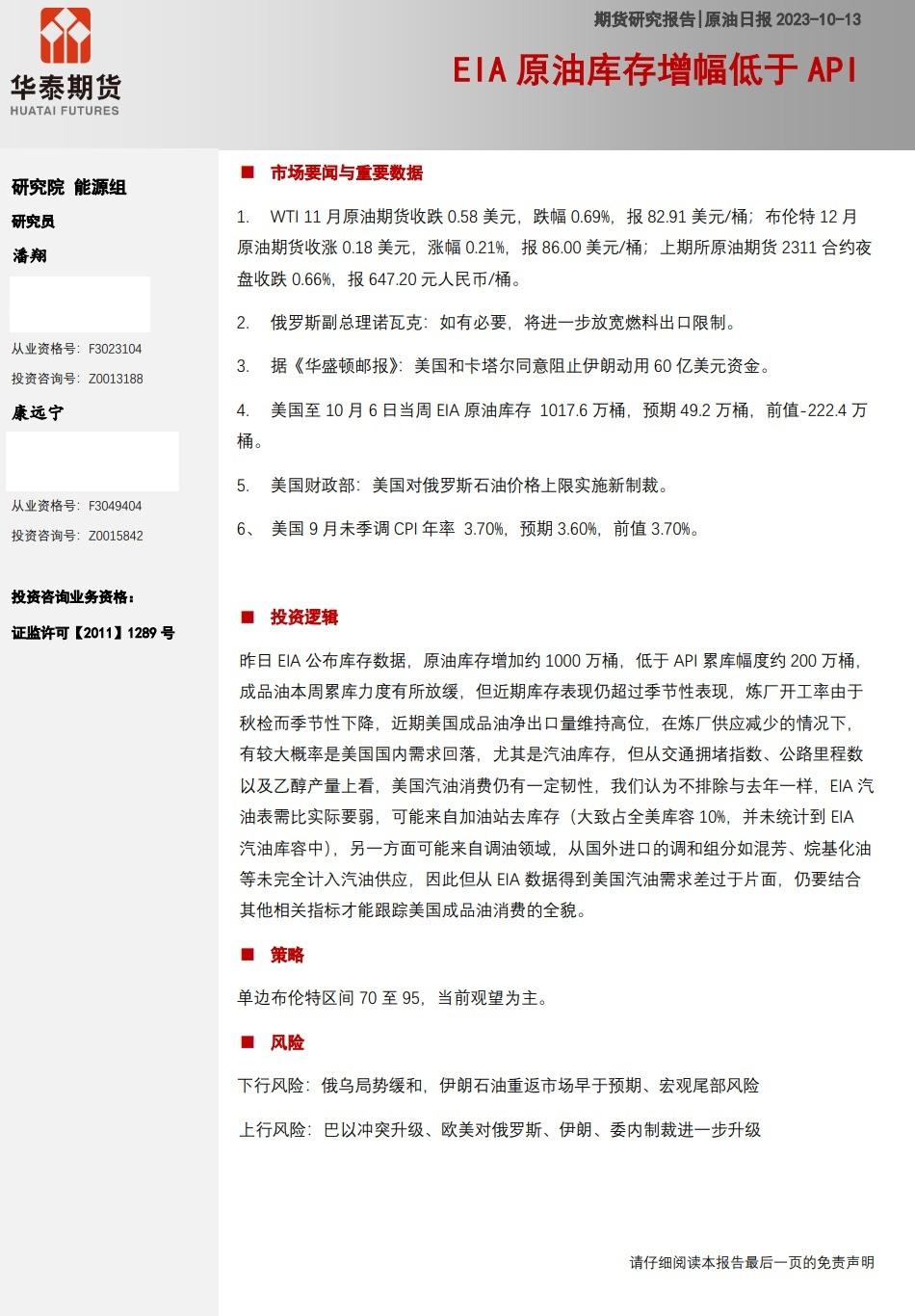 华泰期货10月13日原油日报:EIA原油库存增幅低于API