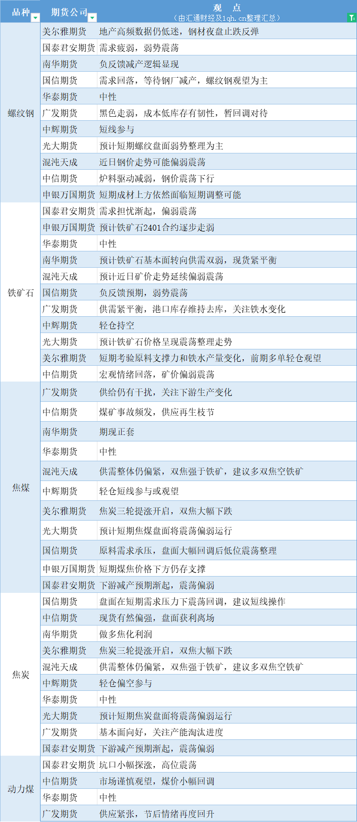 期货公司观点汇总一张图:10月11日黑色系(螺纹钢、焦煤、焦炭、铁矿石、动力煤等)