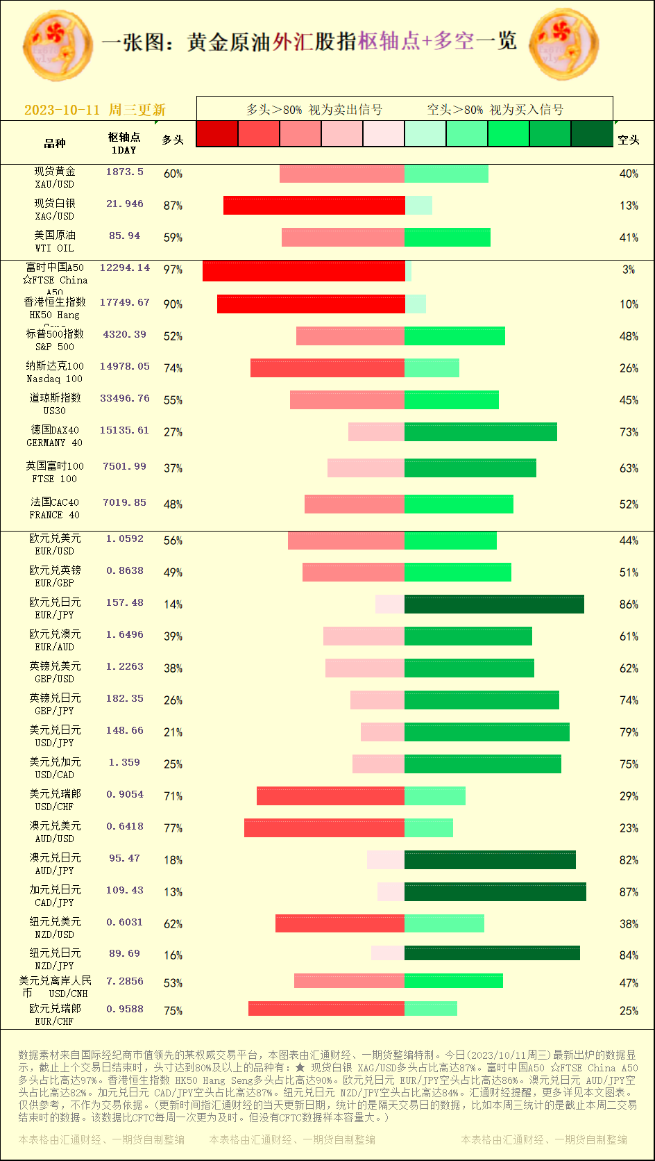一张图:2023/10/11黄金原油外汇股指"枢纽点+多空占比"一览
