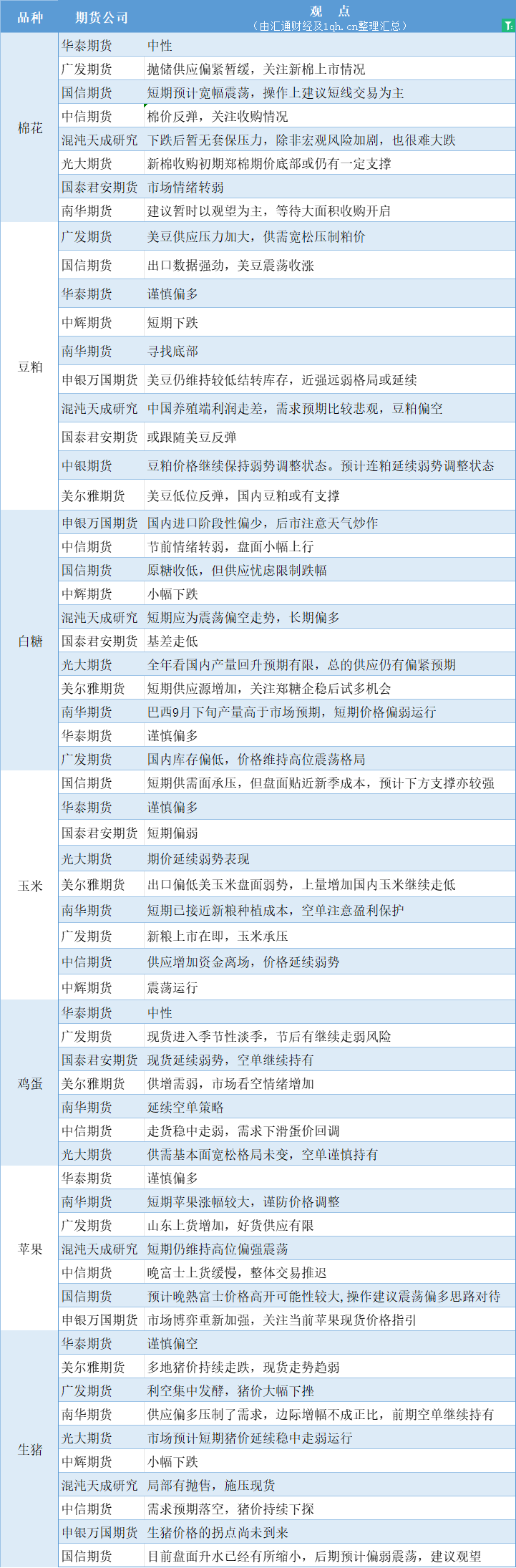 期货公司观点汇总一张图:10月11日农产品(棉花、豆粕、白糖、玉米、鸡蛋、生猪等)
