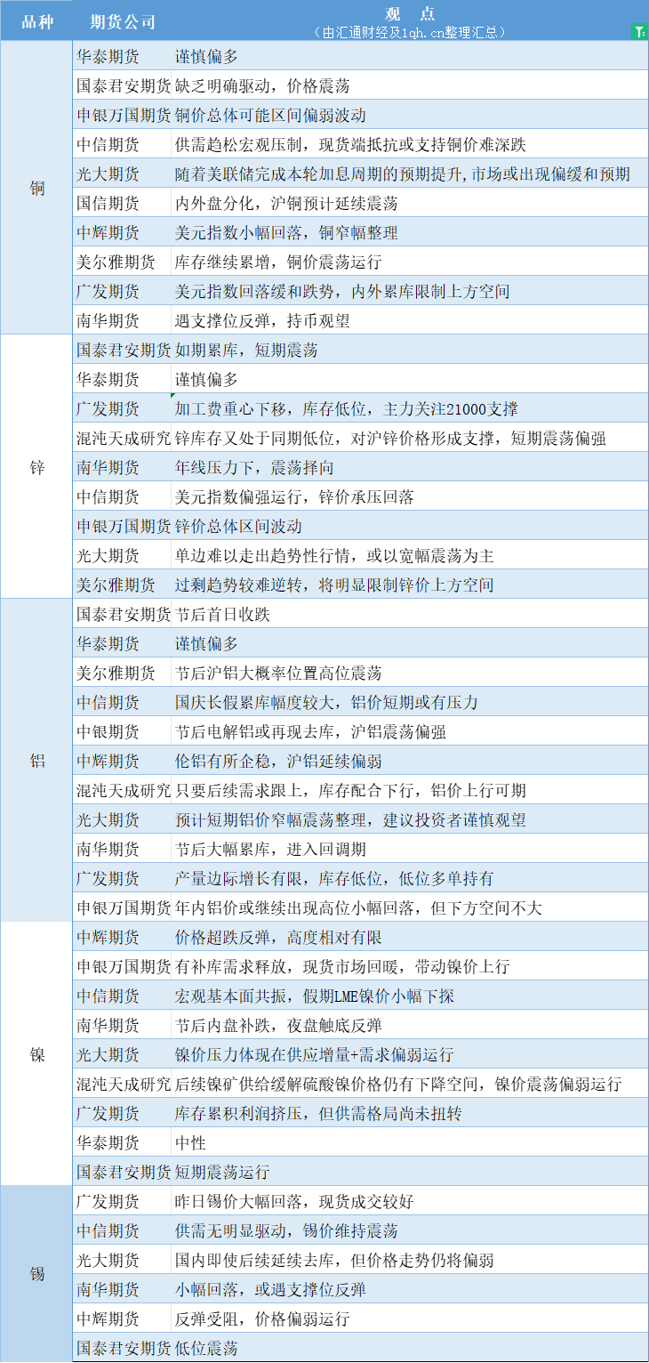 期货公司观点汇总一张图:10月10日有色系(铜、锌、铝、镍、锡等)