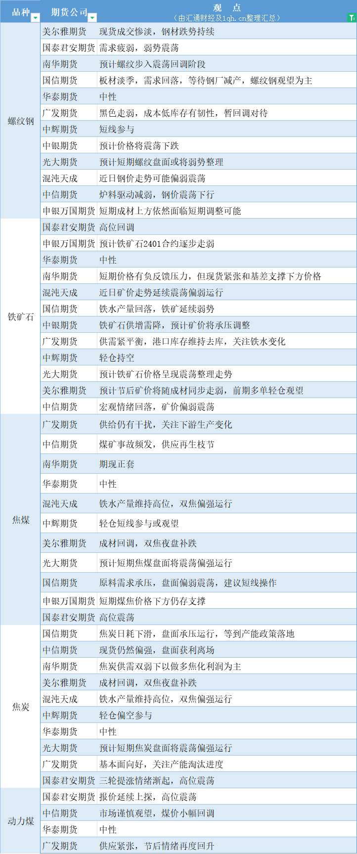 期货公司观点汇总一张图:10月10日黑色系(螺纹钢、焦煤、焦炭、铁矿石、动力煤等)
