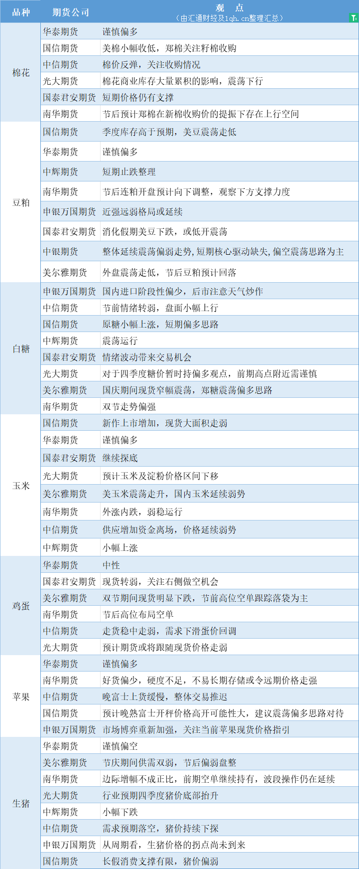 期货公司观点汇总一张图:10月9日农产品(棉花、豆粕、白糖、玉米、鸡蛋、生猪等)