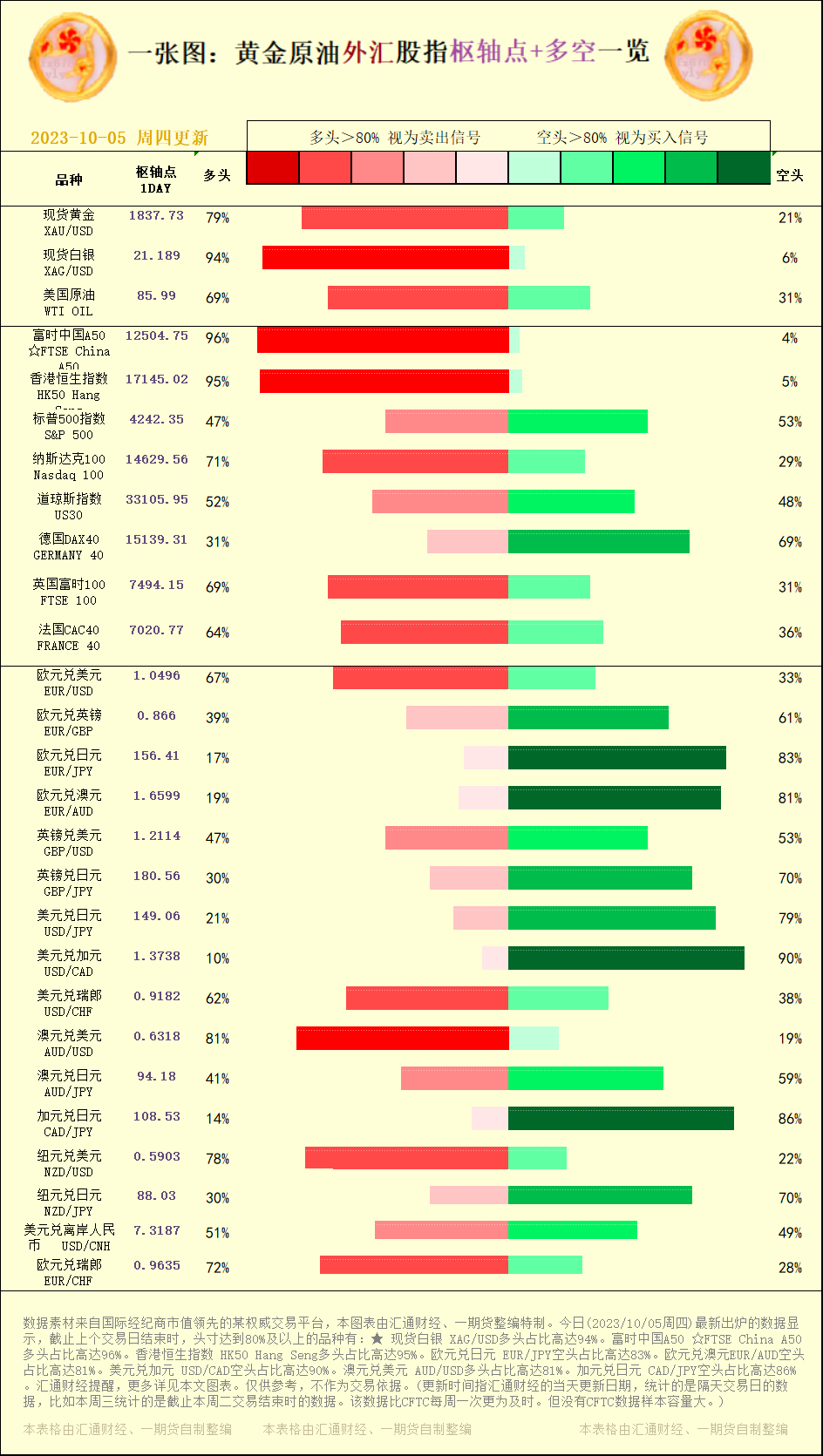 一张图:2023/10/05黄金原油外汇股指"枢纽点+多空占比"一览