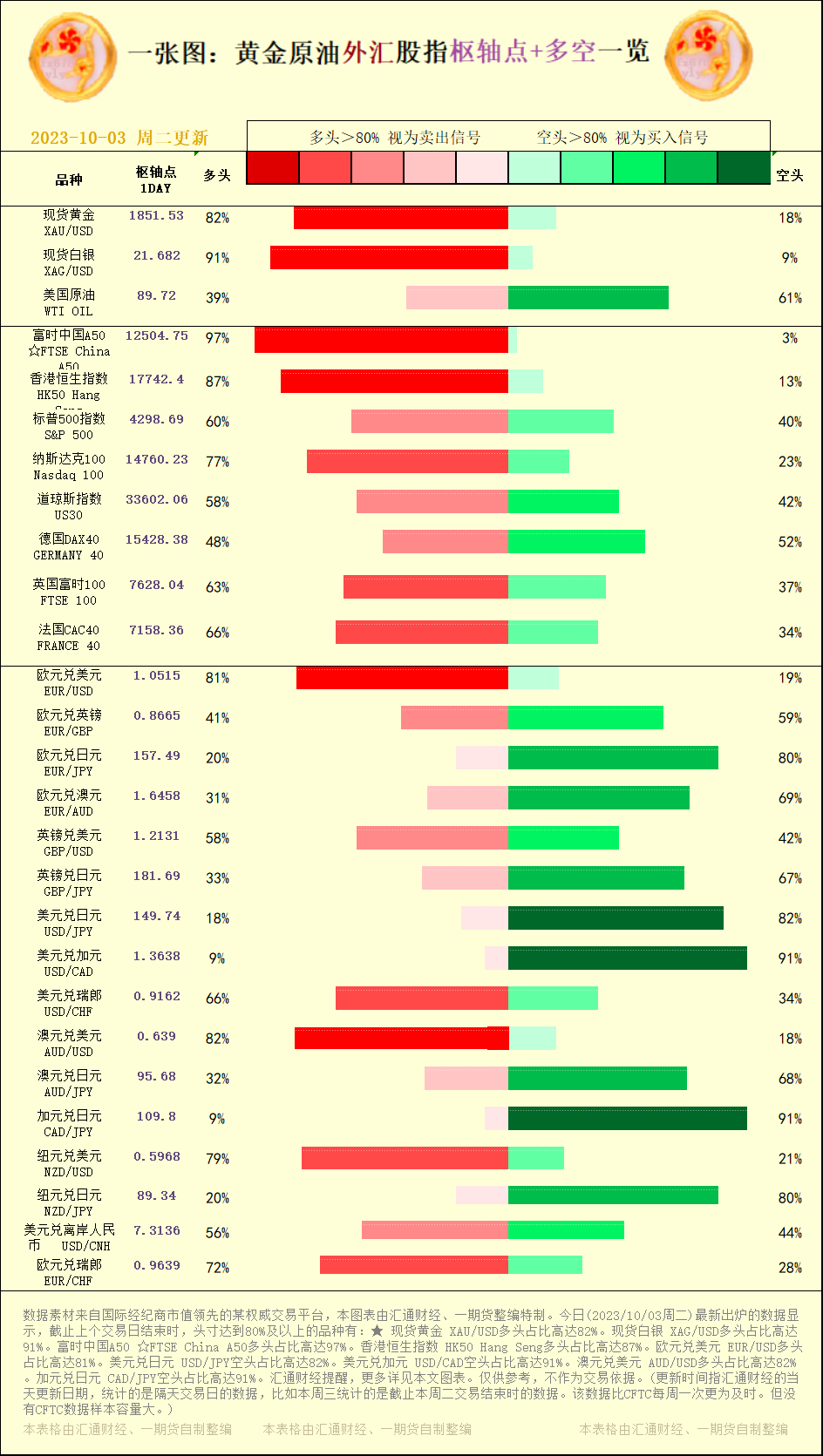 一张图:2023/10/03黄金原油外汇股指"枢纽点+多空占比"一览