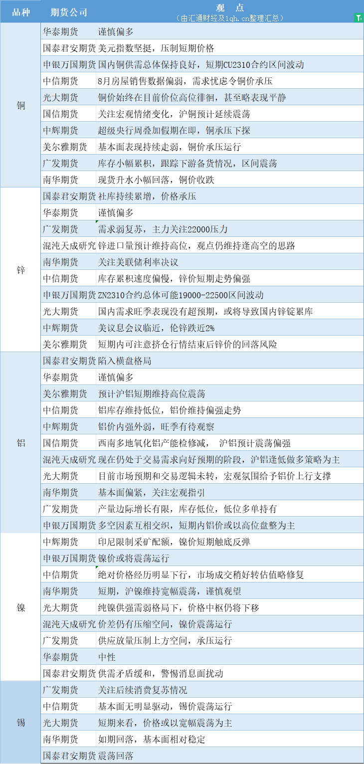 期货公司观点汇总一张图:9月20日有色系(铜、锌、铝、镍、锡等)