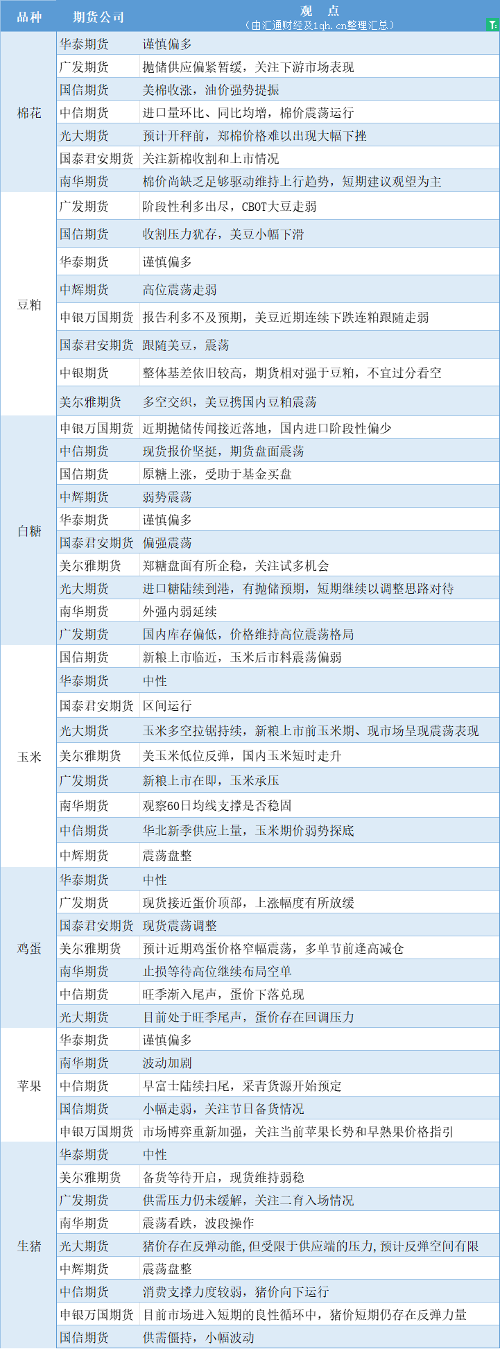 期货公司观点汇总一张图:9月20日农产品(棉花、豆粕、白糖、玉米、鸡蛋、生猪等)