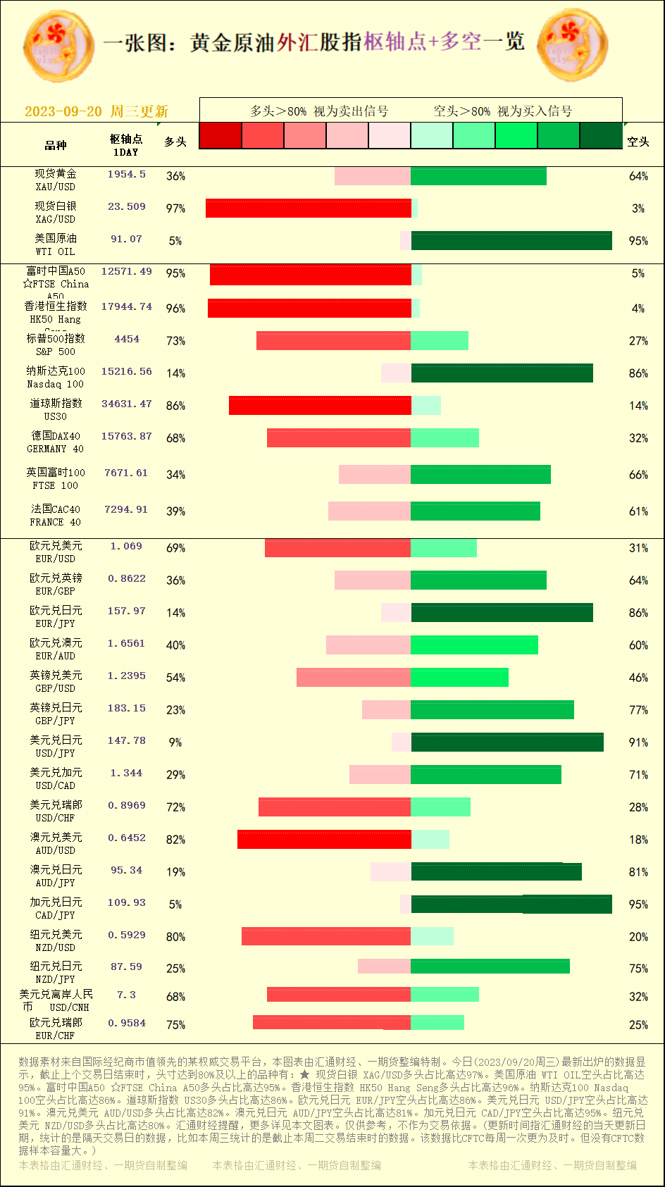 一张图:2023/09/20黄金原油外汇股指"枢纽点+多空占比"一览