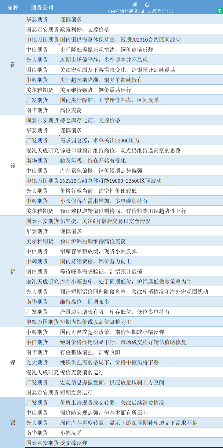 期货公司观点汇总一张图:9月15日有色系(铜、锌、铝、镍、锡等)