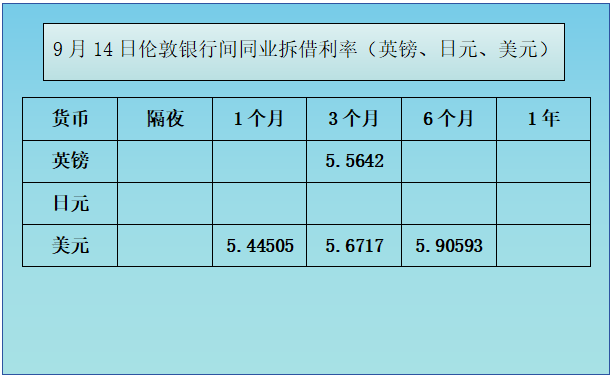 9月14日伦敦银行间同业拆借利率(英镑、日元、美元)