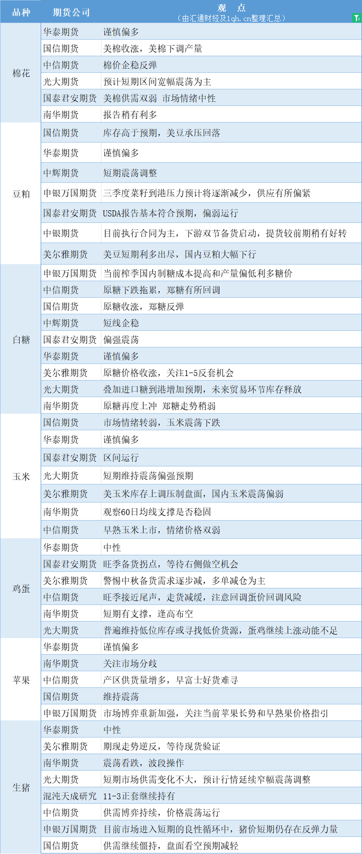 期货公司观点汇总一张图:9月13日农产品(棉花、豆粕、白糖、玉米、鸡蛋、生猪等)