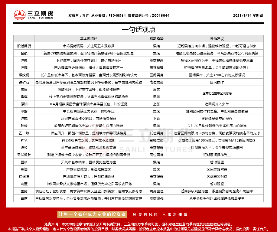 三立期货9月13日沪金、沪银、原油、有色金属等期货操作建议
