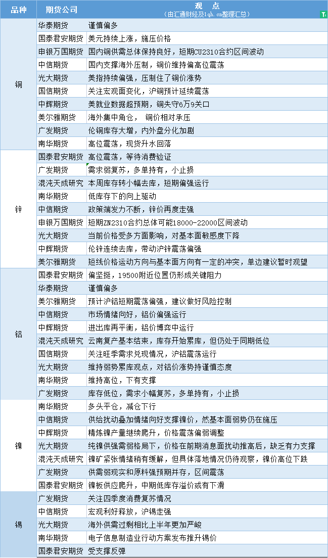 期货公司观点汇总一张图:9月8日有色系(铜、锌、铝、镍、锡等)