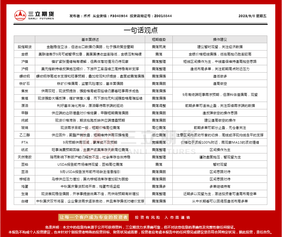 三立期货9月8日沪金、沪银、原油、有色金属等期货操作建议