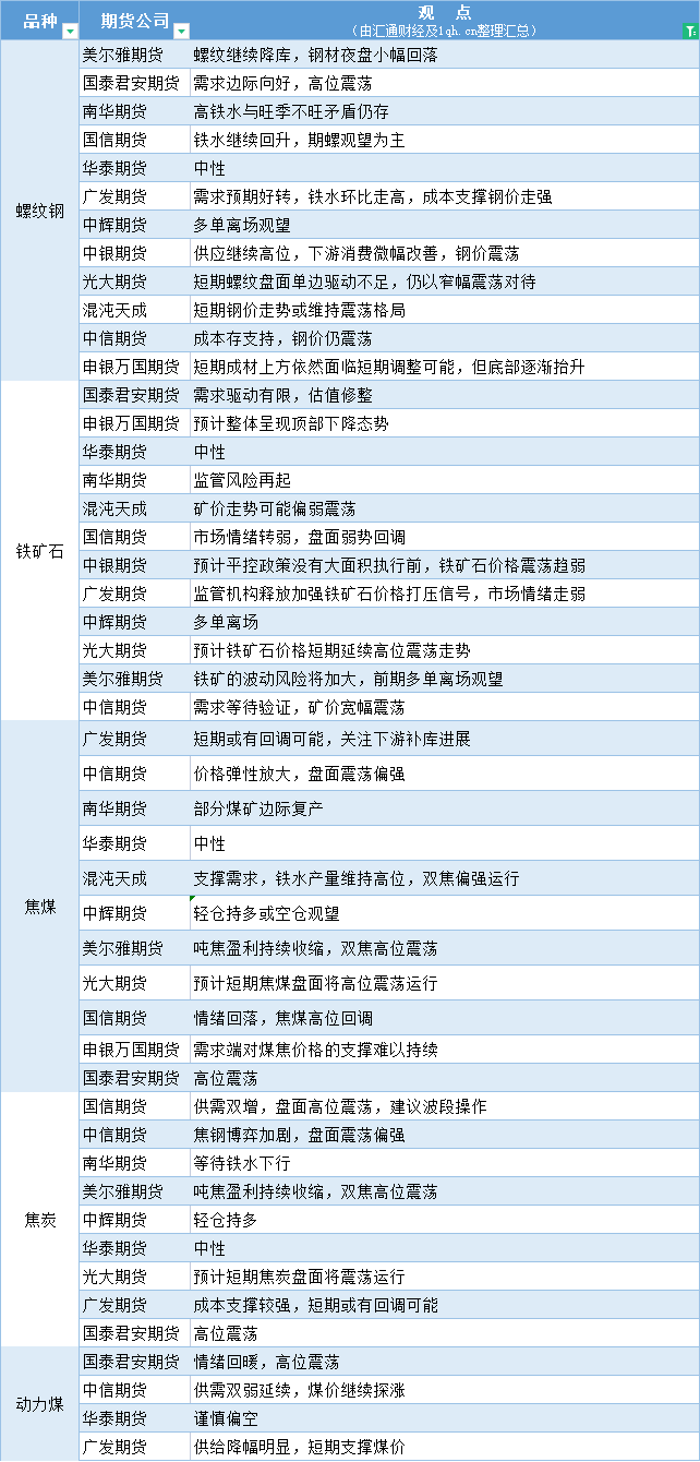 期货公司观点汇总一张图:9月8日黑色系(螺纹钢、焦煤、焦炭、铁矿石、动力煤等)