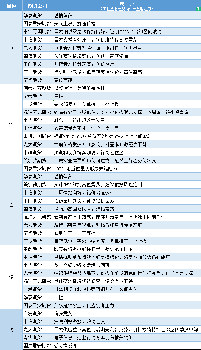 期货公司观点汇总一张图:9月7日有色系(铜、锌、铝、镍、锡等)