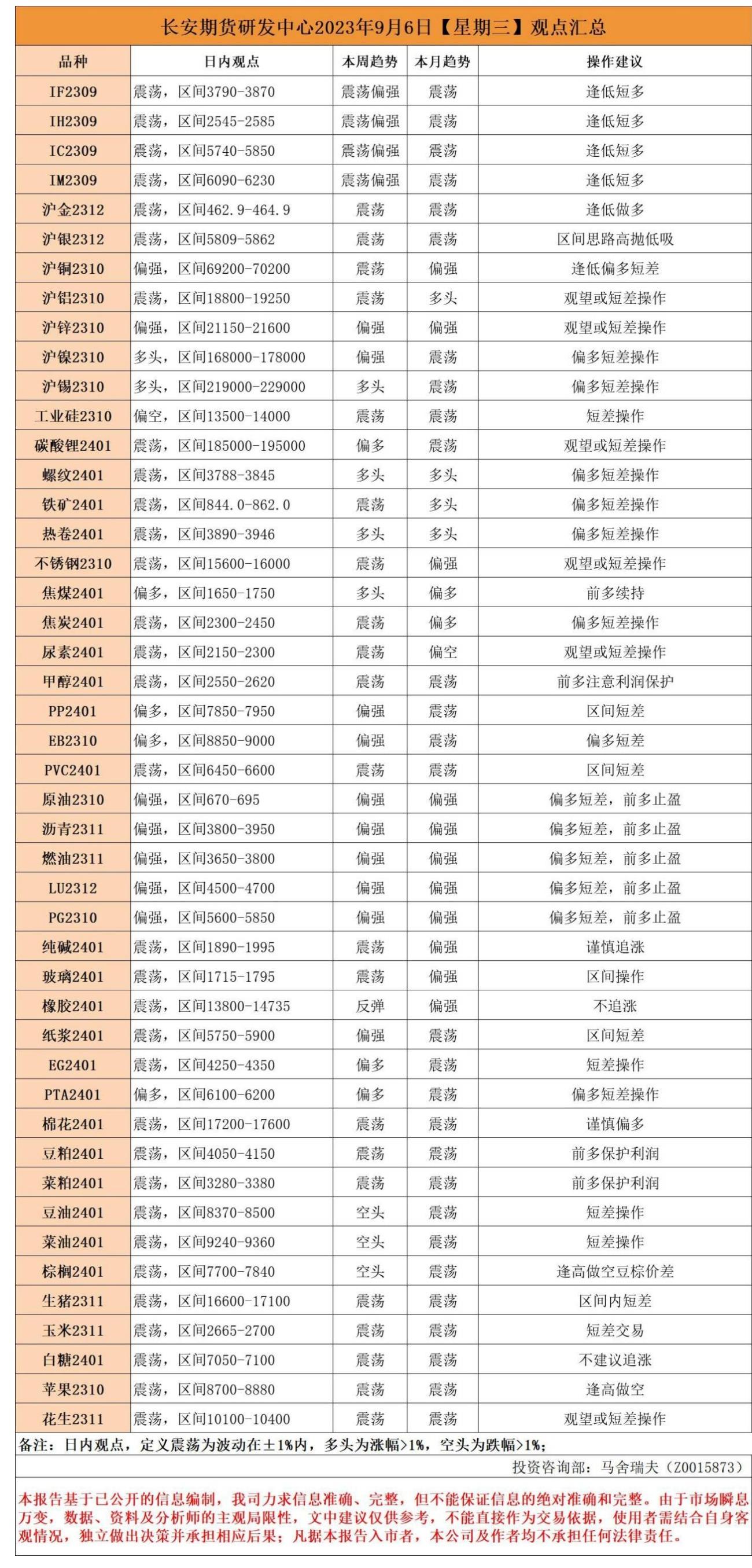 长安期货9月6日早间看盘