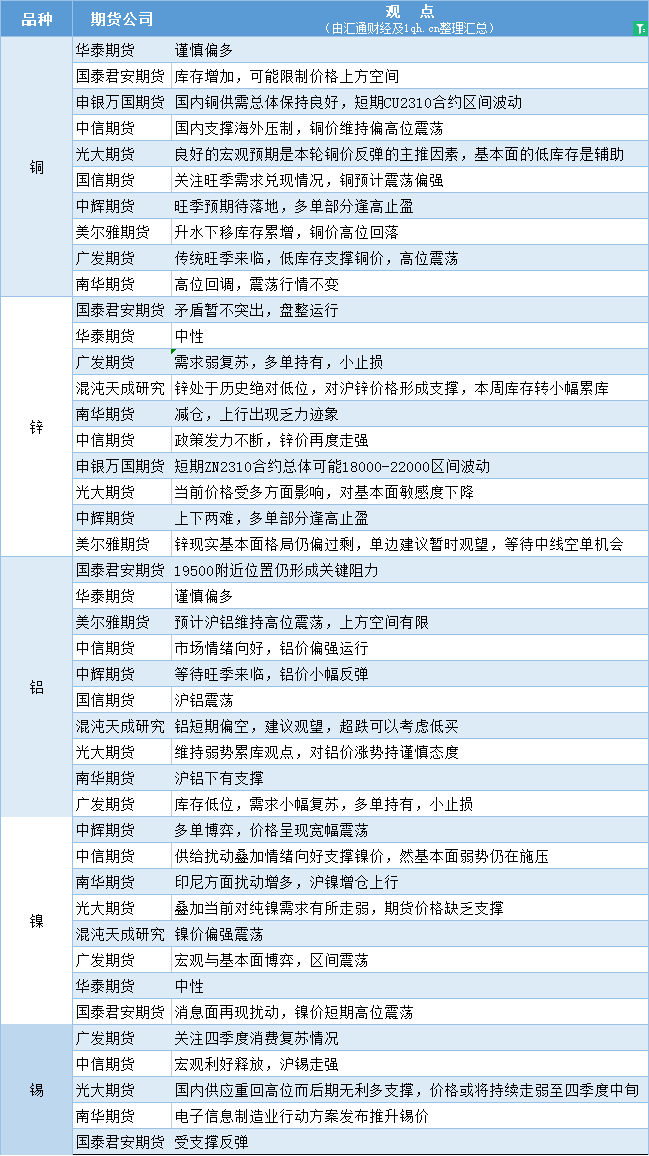 期货公司观点汇总一张图:9月6日有色系(铜、锌、铝、镍、锡等)