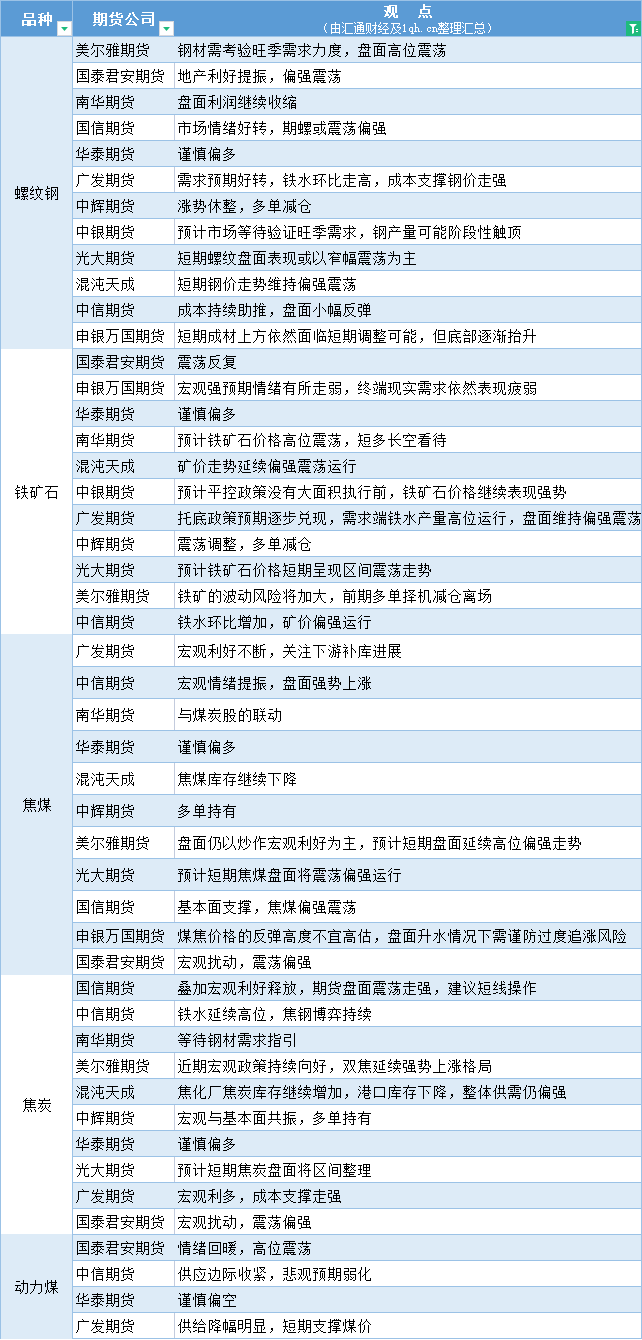 期货公司观点汇总一张图:9月5日黑色系(螺纹钢、焦煤、焦炭、铁矿石、动力煤等)