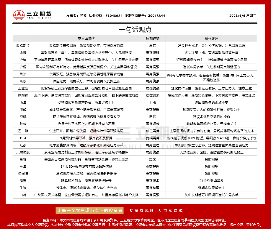 三立期货9月6日沪金、沪银、原油、有色金属等期货操作建议