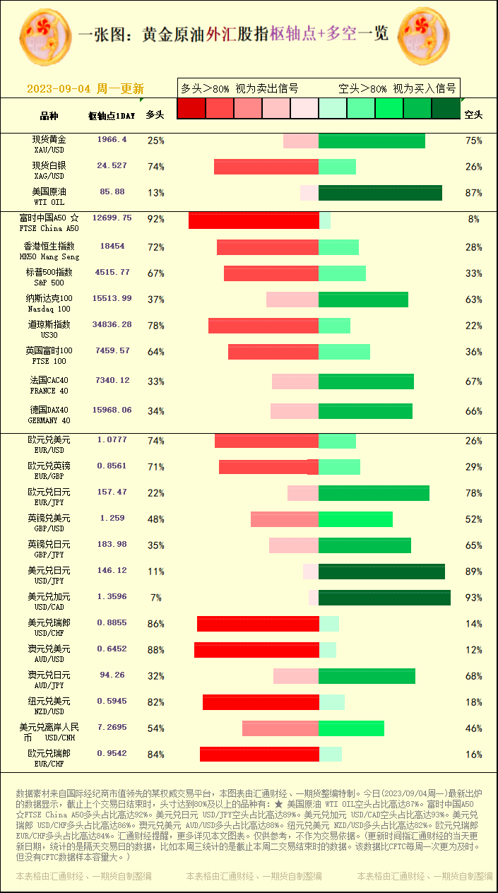 一张图:2023/09/04黄金原油外汇股指"枢纽点+多空占比"一览