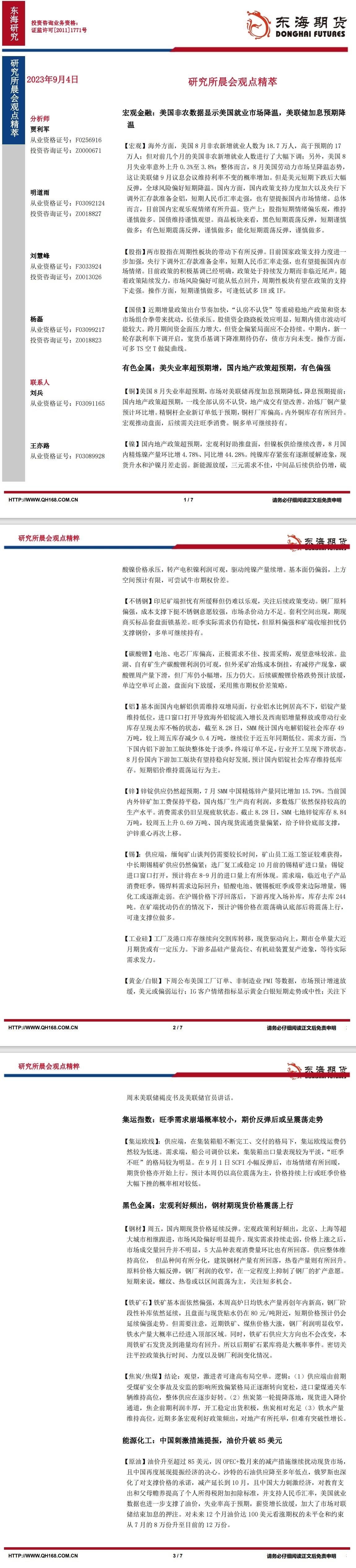 【东海期货9月4日研究所晨会观点精萃】美国非农数据显示美国就业市场降温,美联储加息预期降温